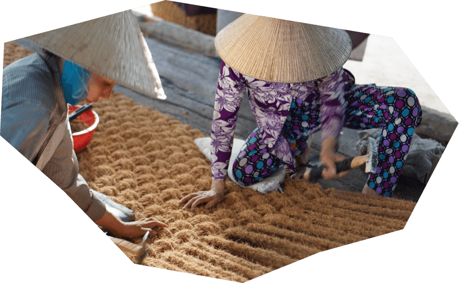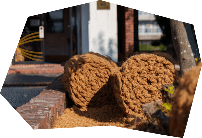 コイヤーグラウンド®は、ココヤシ(ヤシの木)の実の外皮から採れるじょうぶな繊維(コイヤー)を織り上げて作った、お子様や高齢者、ペット、そして環境にやさしい屋外用の多機能マット。製造過程において接着剤など一切の化学原料を使用していない、天然素材100%の製品です。