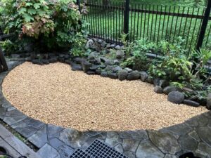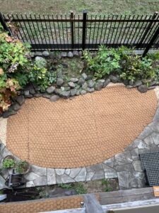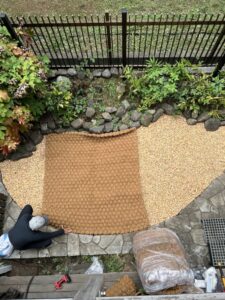 小さく生じた端っこの空白スペースは、もう1ロール使って裁断・ジョイントでもよかったのですが、ジョイント部の金属ピンが若干目立ってしまうこと、そしてレンガチップがとても素敵に景観にマッチしていたので、すべて隠れてしまうのはもったいないなーと感じ、オーナー様にご相談して、このままあらわし(仕上げ)で見せることにしました。