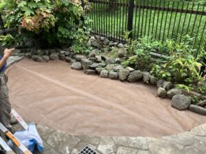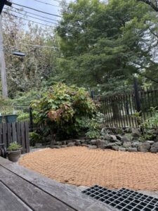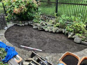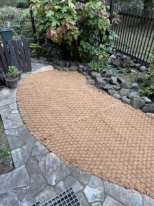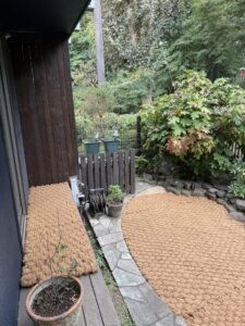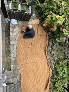敷設面積は小さいのですが、写真奥の積み石は撤去が難しい仕様で、すべてのマットに曲線での裁断が入る、ほぼフリーハンドでの加工となりました。
