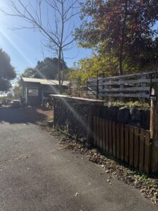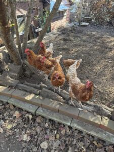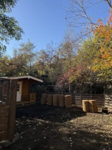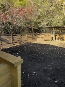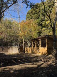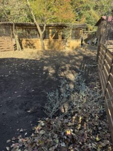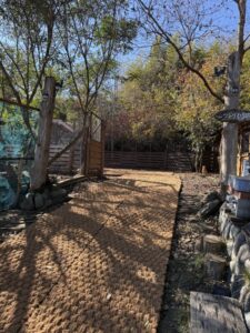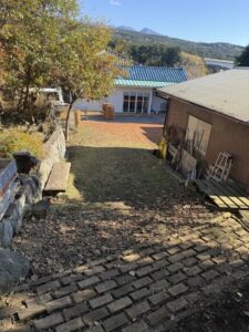 この坂を上ったところに、鶏舎とゲストハウス(?)となる小屋があります。ふもとには、ぬかるみ防止でレンガチップが。莫大な量が必要になるため、坂道まで敷くのを諦めたとか。