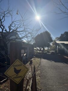 入口の「ニワトリが通ります」の看板にワクワク。お天気も最高でした。