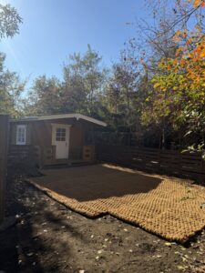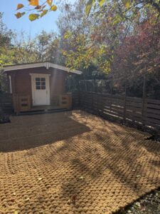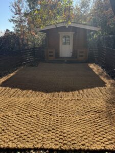 ただし、マットが濡れ色となる時間が長くなり、繊維がしっとりと寝やすく ややフラットな印象になります。雨の日には靴裏に付いた泥がマットに乗り上げやすいので、運用上 新品時の見た目の維持は難しいです。オーナーのM様は、既存の路盤と一体化していく様を楽しみにされているご様子だったので、まさにピッタリの環境かと思います。経年を楽しみにされるなんて、なんだか嬉しいです。