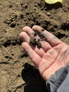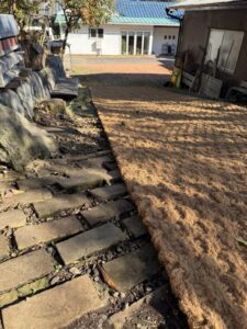 まずは土質をチェック。山肌の黒土+腐葉土といった粘性のある土です。こうした土質は、降雨で自重が増すことでマットが幾分 地中に食い込んで自然収縮による目地の開きが少ない傾向にあります。また、土自体が保水しますので乾燥による収縮そのものが抑えられます。