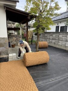 防草シートのグレードを確認し、エアレーションが必要と判断。穴あけ後に敷設しました。