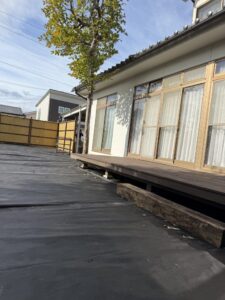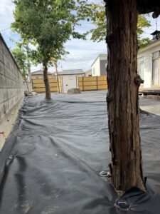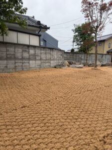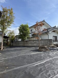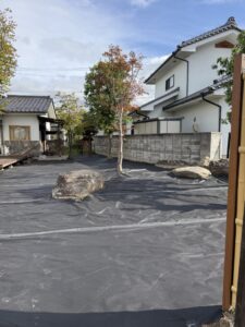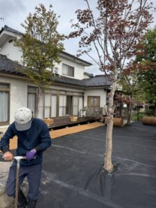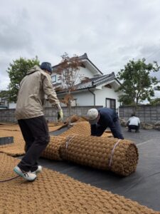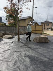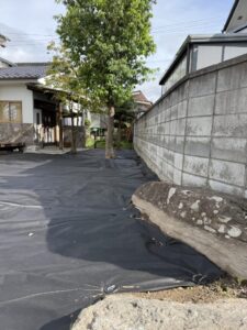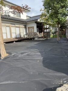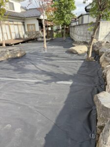 防草シートのグレードを確認し、エアレーションが必要と判断。穴あけ後に敷設しました。