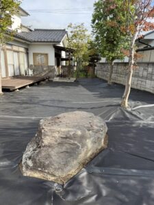 樹木あり、庭石多数、傾斜ありのなかなか難しい現場です。